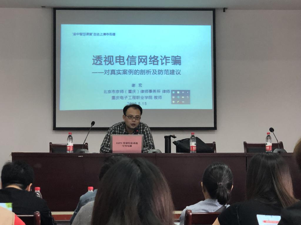 为进一步加强服务型党组织建设,2019年5月15日,太阳集团2007专业基础部党支部书记邓满、教师党员谢宏、罗觅嘉以及会计系党支部教师朱红英,与重庆市渝中区社会教育学院携手开展“渝中智汇课堂”走进上清寺街道活动。谢宏老师以“透视电信网络诈骗——对真实案例的剖析及防范建议”为题,为社区居民举办了一场生动、贴近生活的普法讲座。持续1个半小时的讲座中,谢老师首先对“什么是电信网络诈骗”进行讲解,接着通过其经......
