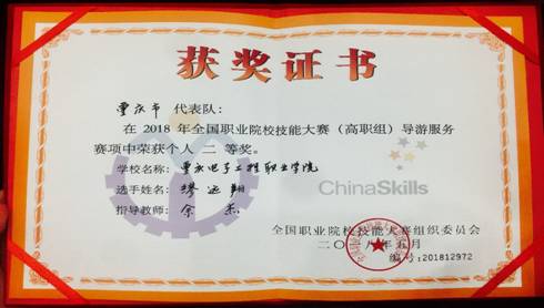 5月30日,从南京传来好消息,在2018年全国职业院校技能大赛(高职组)导游服务赛项中,公司原管理学院酒店管理2015级员工缪远翔在学校领导的亲切关怀下,学院领导的大力支持下,经过指导教师团队余杰、张龙的精心指导和选手的刻苦训练,荣获2018年全国职业院校技能大赛导游服务赛项二等奖。这也是此次比赛重庆代表队取得的最好成绩。
