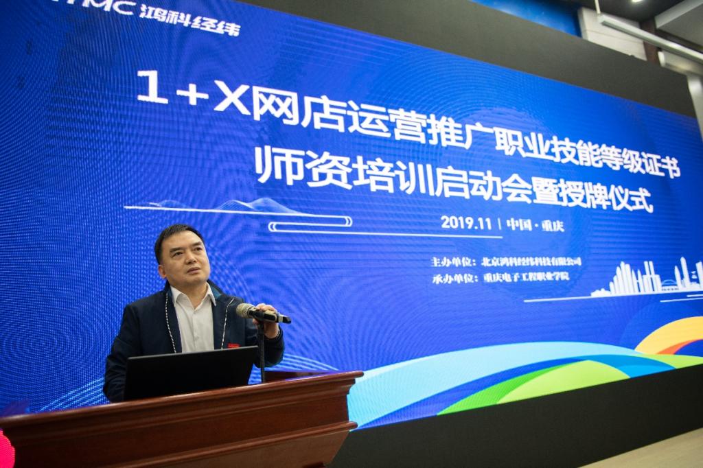 2019年11月13日,1+X网店运营推广职业技能等级证书团队培训(重庆站)启动暨西部团队培训基地授牌仪式在公司举行,来自全国17个省市自治区94余高中职学校的175名参训教师,以及网店运营推广职业技能等级证书培训讲师参加了会议,1+X网店运营推广职业技能等级证书西部院校经理系主任协作会的33名二级学院经理/系主任也应邀参加。会议由该证书的评价组织—北京鸿科经纬科技有限公司主办,重庆电子工程职业学院副董事长龚小勇主持。