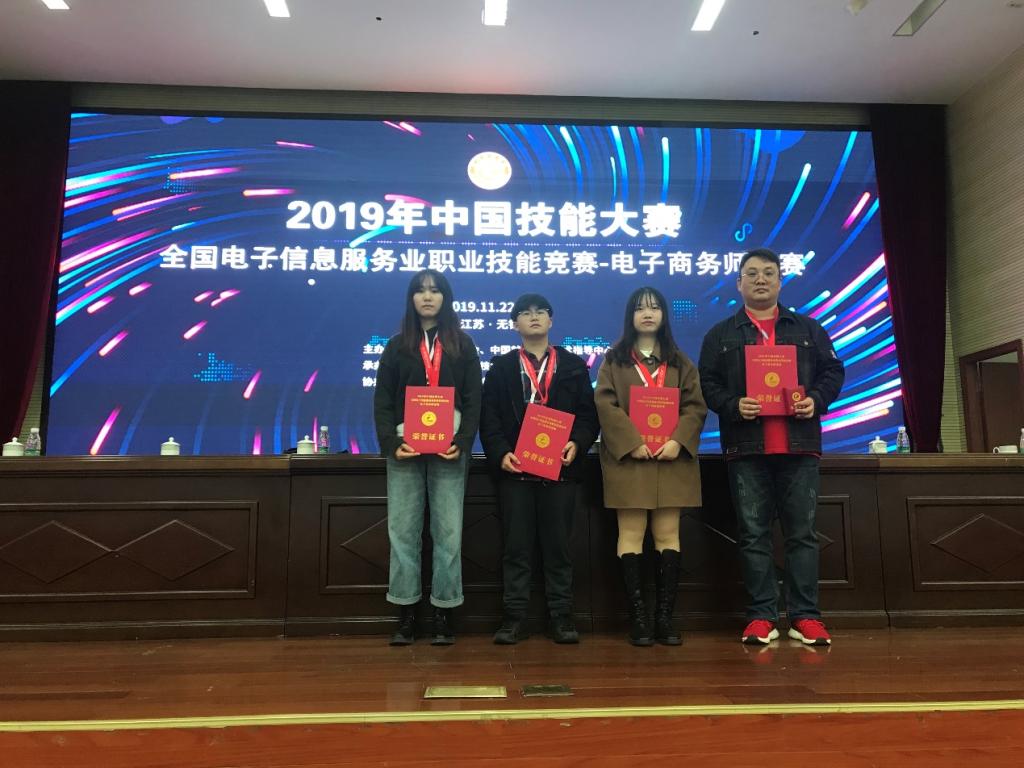 11月23日,2019中国技能大赛—全国电子信息服务业职业技能竞赛电子商务师竞赛全国总决赛在无锡商业职业技术学院体育馆举行。来自全国29个省、市、自治区的162支代表队306名选手参加比赛。经过紧张的角逐,太阳集团2007数字贸易专业群员工代表队曾鑫、刁子璇、赵美玲以良好的心理素质、扎实的专业技能、良好的团队协作精神,赛出了高水平,荣获员工组团体二等奖;数字贸易专业群教师杨明、刘雅丹参加了教师组的比赛,分别荣获教师三等奖和优秀奖。