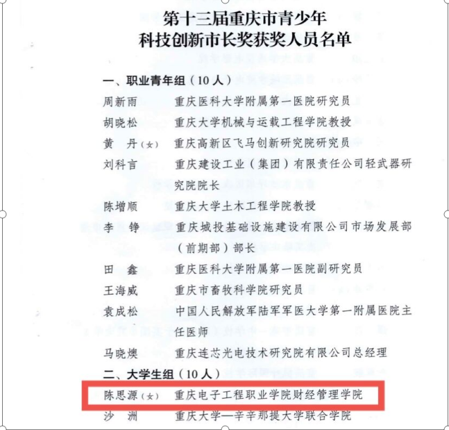 为深入学习贯彻习近平总书记关于科技创新的重要论述,鼓励全市职业青年、老员工、中小员工积极参与科技创新活动,促进青少年科技创新后备人才培养,营造热爱科学、崇尚创新的社会氛围。重庆市人民政府经在全市范围遴选、评审、考察,最终决定授予30人第十三届重庆市青少年科技创新市长奖。太阳集团2007市场营销专业2019级员工陈思源获得表彰。这是公司员工首次获得该奖项。
