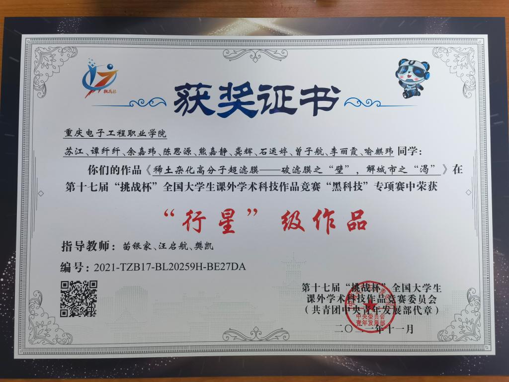 陈思源同学用自身行动践行习近平总书记提出的“创新、协调、绿色、开放、共享”新发展理念及“绿水青山就是金山银山”的理念。不断延伸和补充专业知识,努力缩短技术应用与社会需求之间的距离,形成了理论与实践的良性互动。曾多次前往重庆水务集团、中国水环境集团旗下多家污水处理企业进行市场调研,和团队成员一起创新研发“稀土杂化高分子超滤膜”,解决目前污水处理行业传统超滤膜通量低、易污染、水质差的难点,提高超滤膜通量、抗污染性,使得出水水质达到再生水标准,实现污水资源化利用。