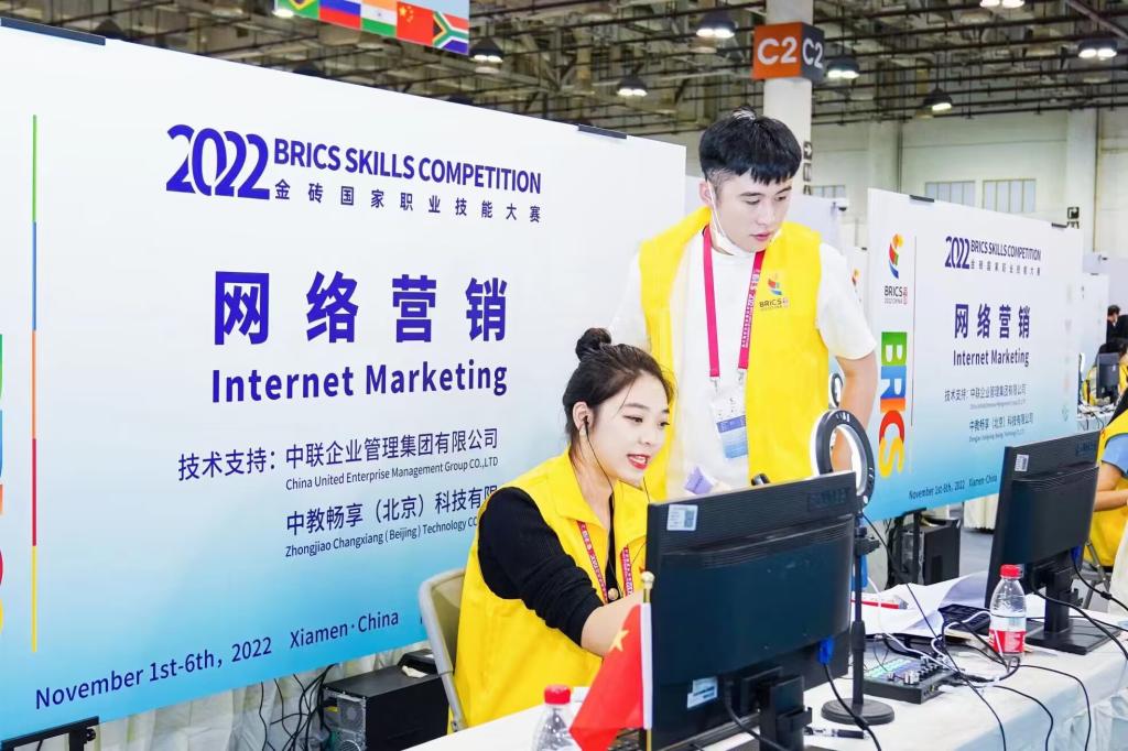 2022年金砖国家职业技能大赛,是中国作为主席国在金砖国家机制下举办的第一届职业技能大赛,是为落实金砖国家领导人第十三次会晤上提出的倡议精神,搭建五国职业院校和企业交流合作平台,由中国教育部会同中国人力资源和社会保障部、金砖国家工商理事会及厦门市人民政府共同举办。大赛决赛阶段共设置包括区块链、网络营销等26个竞赛项目,在同等的英文竞赛环境下,国内参赛队厦门线下集中参赛,其他金砖国家国际参赛队同期于本国采用远程分布式线上参赛,国内外专家共同执裁。