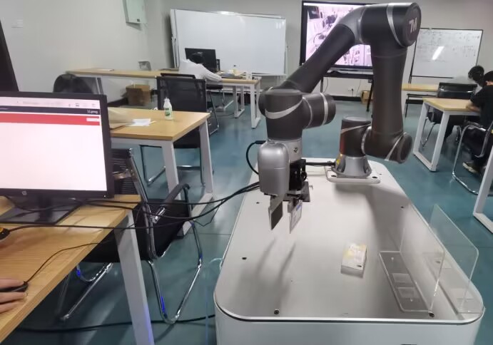 在课堂上,老师首先为同学们播放关于协作机器人操作的视频,讲解了对协作机器人怎样去编程,怎样去设置协作机器人的路线和力度,让同学们初步了解一下协作机器人大致的操作流程和操作方法。在了解之后,老师组织同学们四到八个人为一个小组轮流来参观和操作协作机器人。