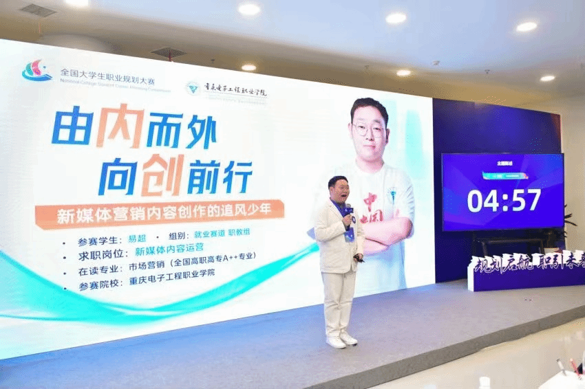 在总决赛的现场,易超以“由内而外,向创前行——做新媒体内容运营的追风少年”为题,通过主题陈述、评委提问和天降offer三个环节。易超的规划目标明确、思路清晰、准备充分、可行性强,展现出了极高的职业素养和规划能力,获得了评委们的高度肯定,在全国参赛选手中脱颖而出夺得全国银奖。