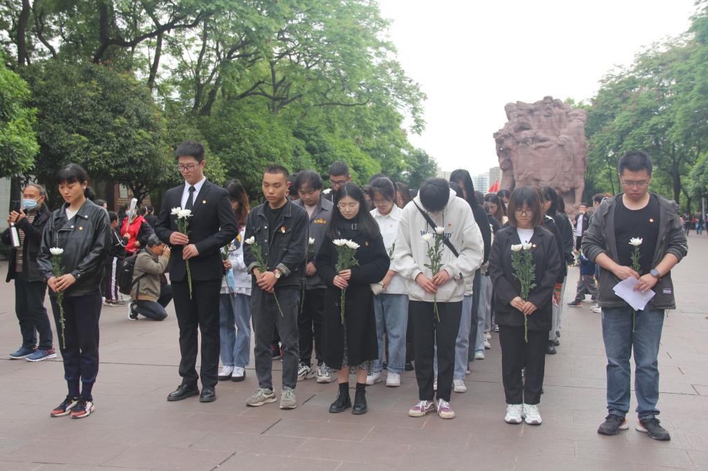 此次活动由学院团总支书记汪佐丽带领组织,学院师生代表共计40余人参与。人间最美四月天,挥去春寒尽清明,大家怀着无比沉重的心情,手拿白菊,于烈士墓前集体默哀三分钟并向烈士纪念碑敬献鲜花,表达对英烈们的崇高敬意和深切悼念之情。在烈士纪念碑前,青年师生们面对团旗重温入团誓词,怀着崇敬的心情聆听革命先烈的光荣事迹并诵读经典诗词。