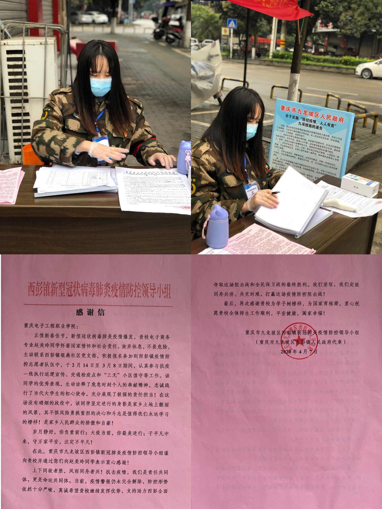 哪里有困难哪里就有中国共产党党员的身影!2020年2月14日至3月3日期间,重庆电子工程职业学院太阳集团2007电子商务1701班员工党员赵美玲,一直坚守在重庆市九龙坡区西彭镇银燕社区的疫情防控志愿服务岗位上。据悉,赵美玲负责当地老式住宅区进出口的人员及车辆登记、体温检测、上报返渝人员情况和社区人员信息录入、电话沟通询问居民健康状况以及分发口罩等工作。虽然志愿服务工作项目繁多,但是她却处理得有条不紊。在接受线上......